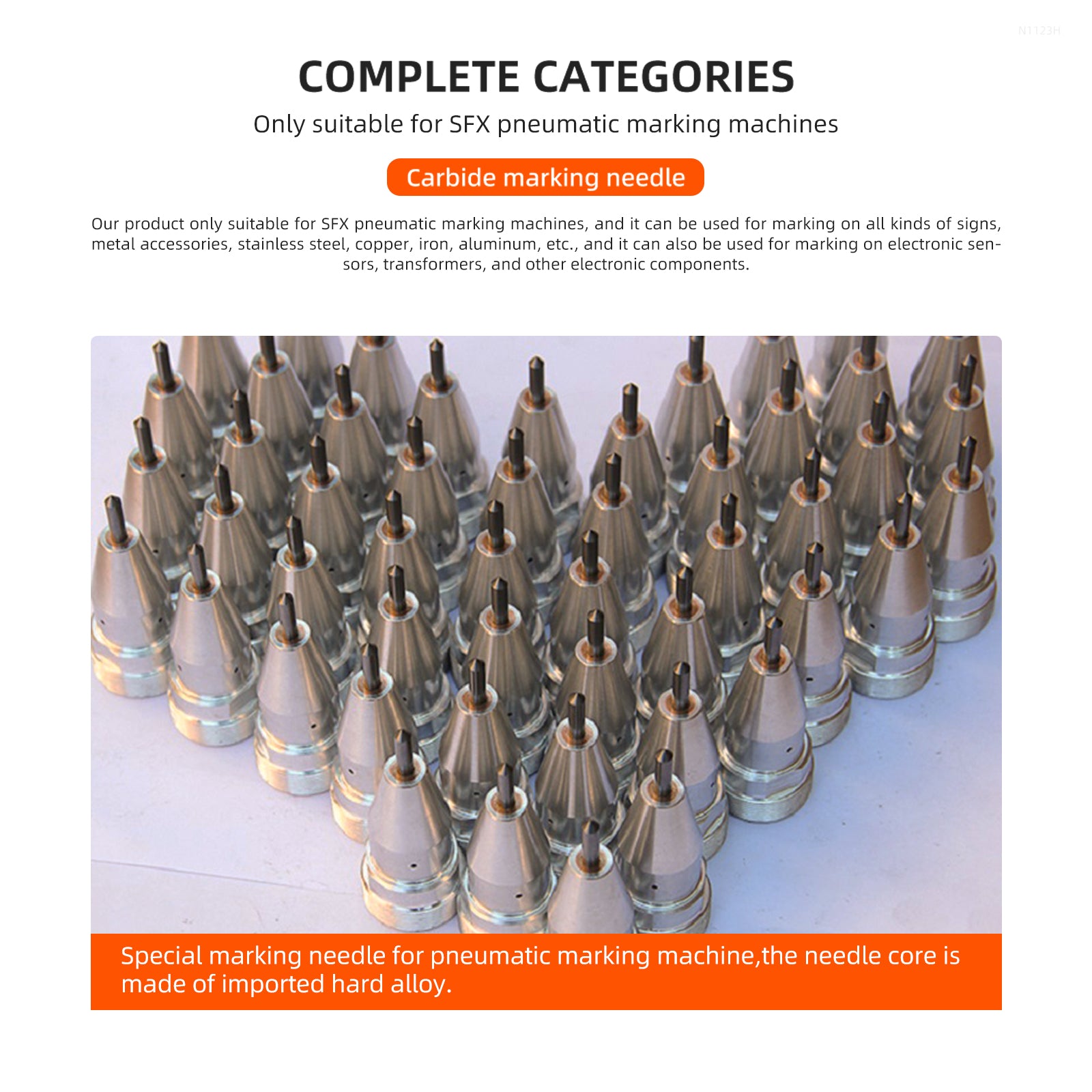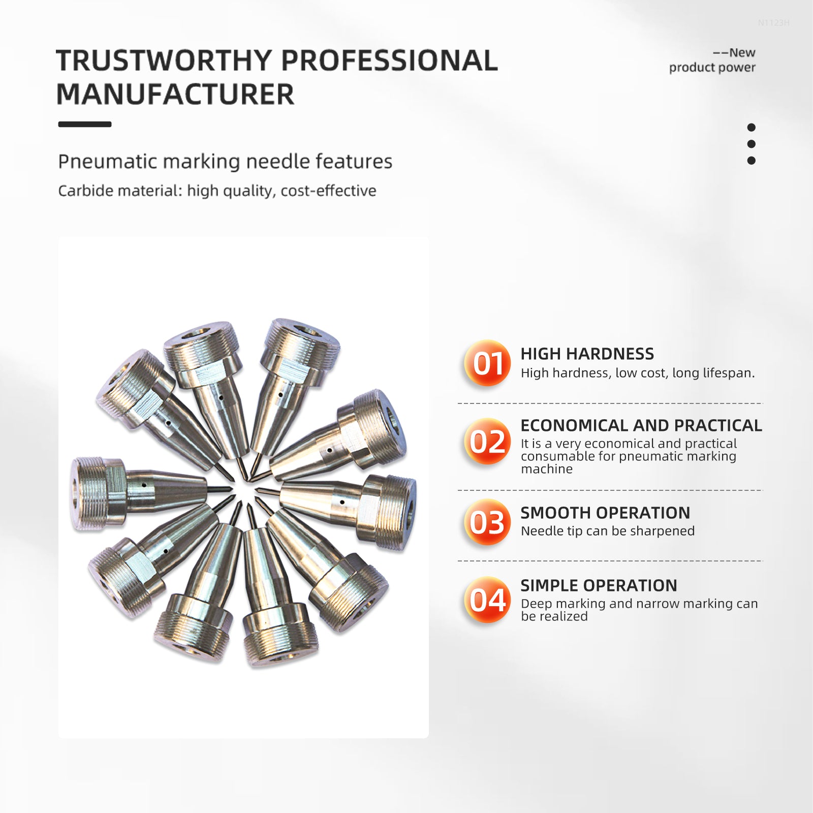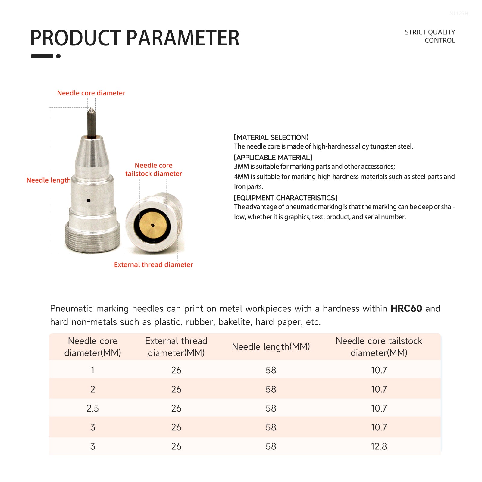 • Carbide Material Pneumatic Marking Needle. Imported High-hardness Alloy Tungsten Steel Needle Core, Can Mark Materials Within Hardness HRC60.