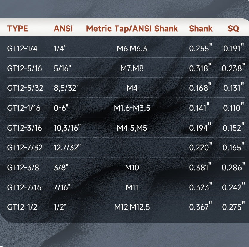 GT12 ANSI Tapping Collets for M16R Electric Tapping Arm and PENU-M12 Pneumatic Tapping Machine