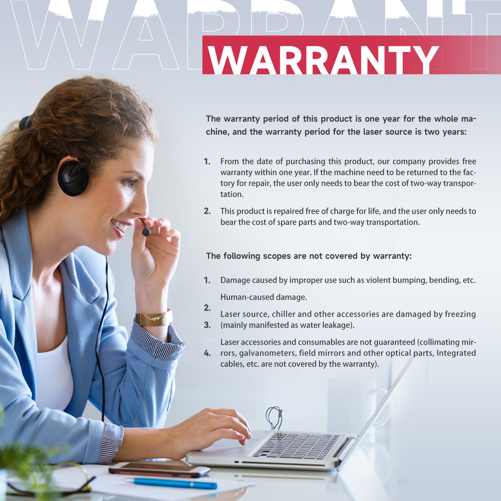 - One year warranty for the whole machine and two years warranty for the laser source.