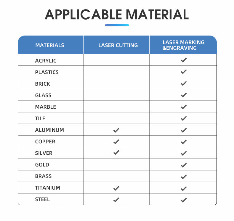 Applicable Material: Aluminum, Stainless Steel, Brass, Copper, etc. Also some of nonmetal such as nylon, light button, ABS, PVC, PES, etc.