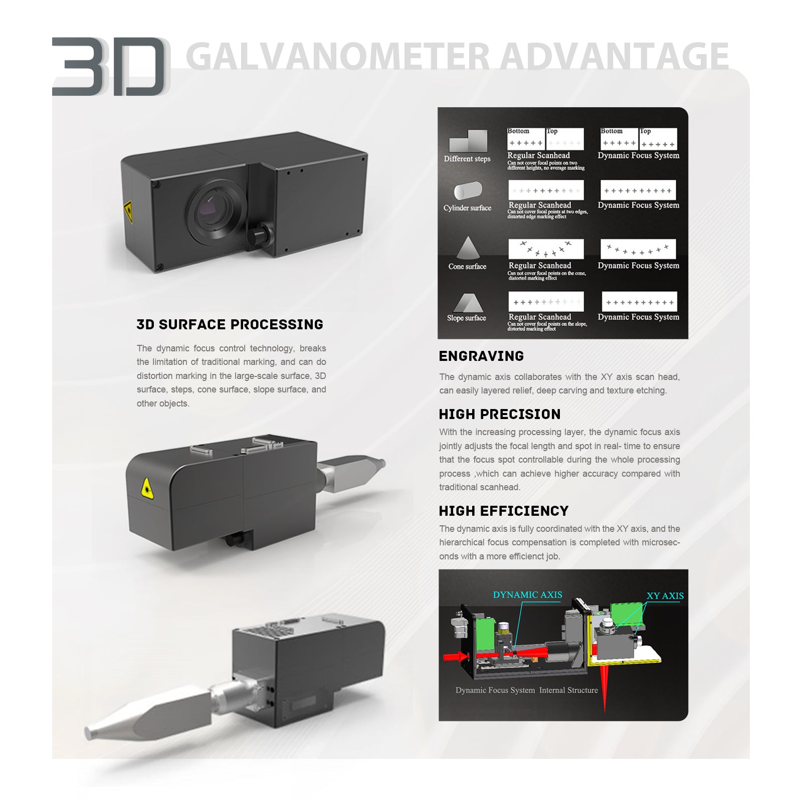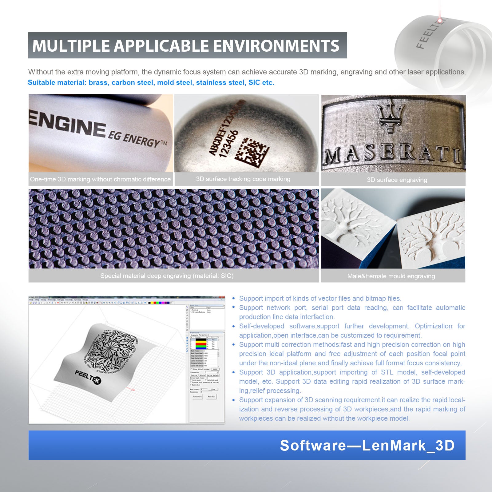 • Multiple applicable environments. Without the extra moving platform, the dynamic focus system can achieve accurate 3D marking, engraving and other laser applications.