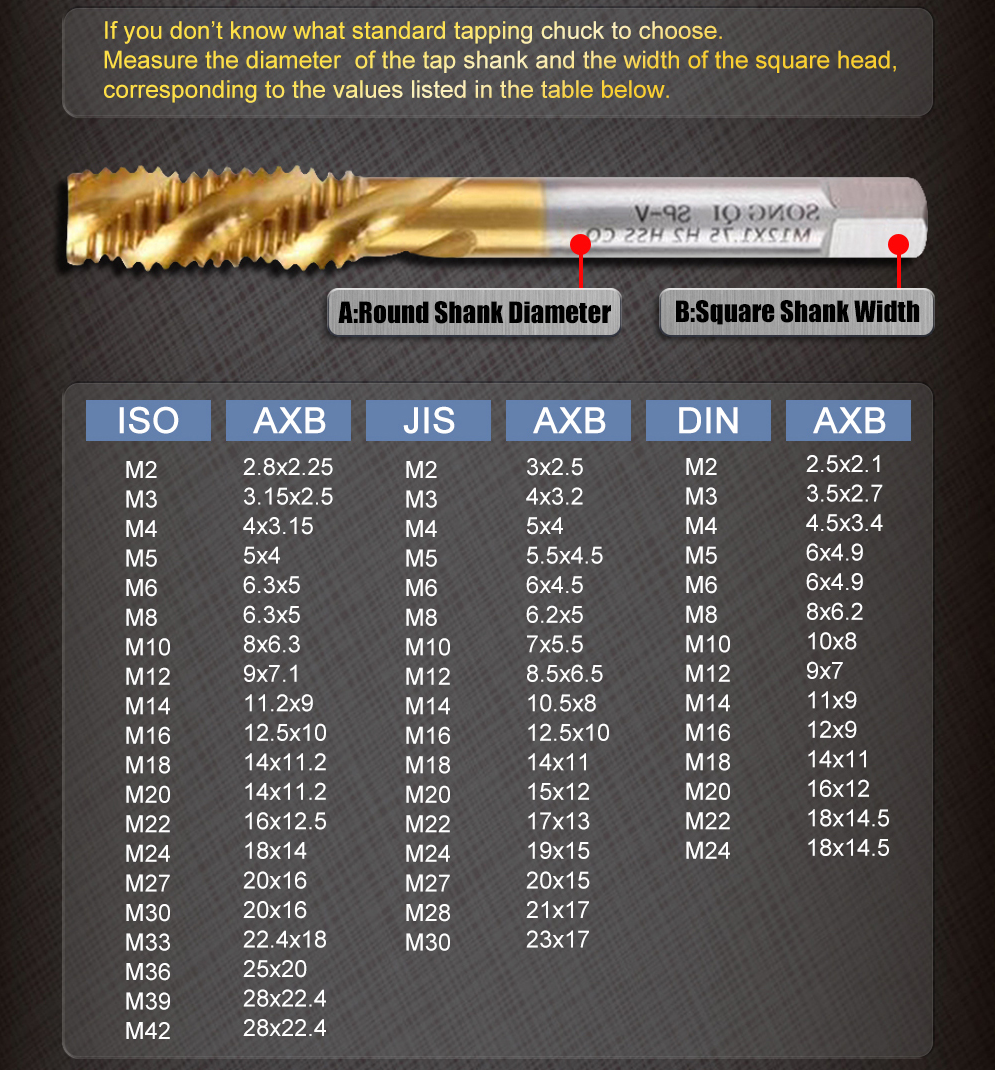 The tapping machine comes with a standard set of ANSI collets, as well as options for ISO, JIS, and DIN collets. If you need a different set of collets, please let me know.