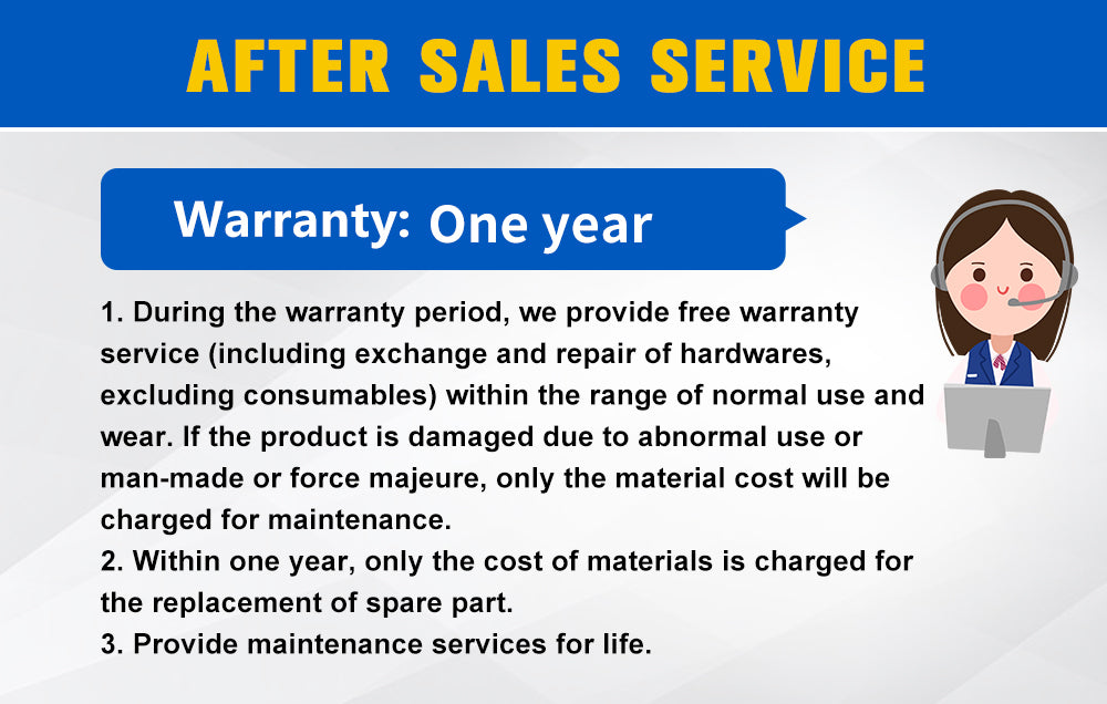 - We provide professional technical support. English user manual, operation video sending together with the machinery. During the warranty period, if the spare parts was sent back for repair, we will pay for the returning shipping cost and fees, repair them for free including the new parts that needed. (exclude wearing parts)